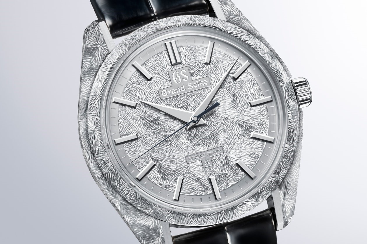 SBGZ011 dari Grand Seiko hadir sebagai sebuah karya Masterpiece yang terasa begitu puitis, seolah membawa kita langsung ke suasana magis Air Terjun Tateshina di hutan purba Shinshu, Jepang. Jam ini menggunakan movement Spring Drive manual-winding, dibalut dalam case Platinum 950 yang mengusung desain ikonik 44GS dengan garis tegas dan permukaan datar yang khas. Yang membuatnya benar-benar istimewa adalah detail ukiran tangan pada seluruh bagian case. Garis-garis halus tersebut mengalir mengikuti kontur, menyerupai aliran air yang jatuh dari ketinggian, menciptakan kesan dinamis yang lembut sekaligus menenangkan.