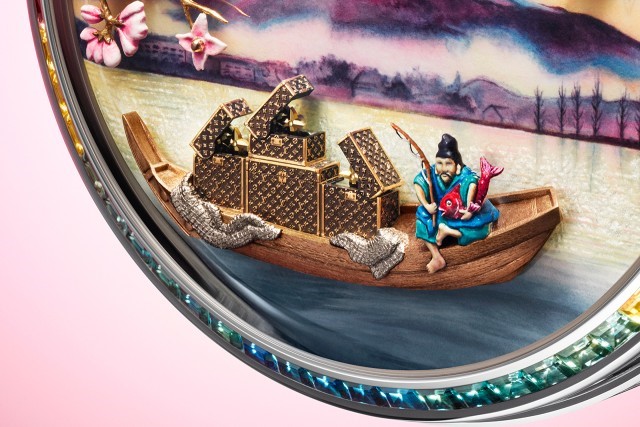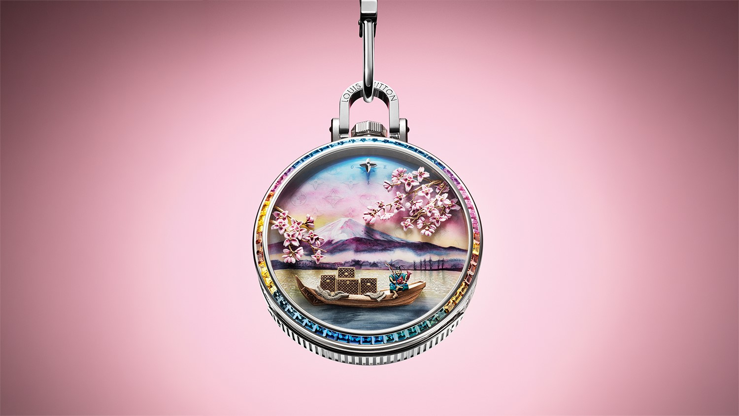 Di atas perahu tersebut terdapat sebuah miniatur koper Louis Vuitton yang dirancang sangat detail. Koper kecil ini dapat terbuka secara mekanis dan menampilkan bunga Monogram khas merek tersebut, menghadirkan sentuhan identitas Louis Vuitton yang kuat dalam komposisi artistik dial. Sementara itu, di sekitar adegan tersebut, bunga sakura emas tampak bergoyang lembut, menambah nuansa puitis yang merefleksikan suasana musim semi di Jepang.